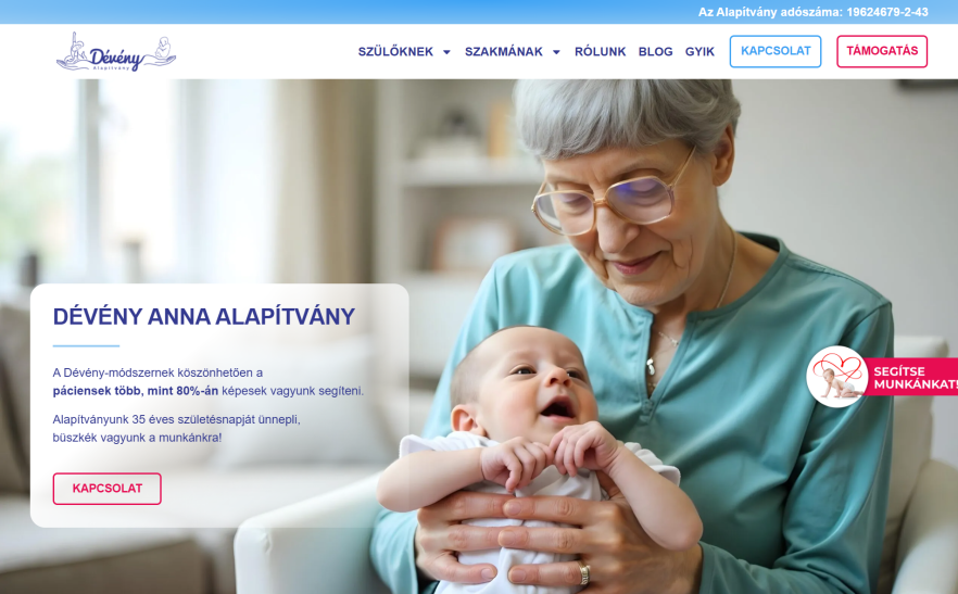 A Dévény Anna Alapítvány weboldala elsősorban társadalmi és szakmai ismertségének növelését, valamint a szervezet iránti bizalom és támogatási kedv erősítését szolgálja. A honlap célja bemutatni a DSGM, azaz Dévény Speciális manuális technika–Gimnasztika Módszer jelentőségét és eredményeit. Az oldal kommunikációja hármas fókuszú, tükrözve az Alapítvány küldetését: egyrészt a módszer hátterének biztosítása, fejlesztése és népszerűsítése, másrészt a módszer tiszta formájának megőrzése (annak érdekében, hogy a Dévény-módszert ne keverjék más eljárásokkal), harmadrészt a gyógytornász-utánpótlás képzése és továbbképzése – ezeket a célokat expliciten is megfogalmazza a honlap tartalma. A marketingkommunikáció fontos eleme az Alapítvány eredményeinek és hitelességének bemutatása: 35 éves fennállás, több ezer kezelt gyermek, valamint Dévény Anna személyének és szakmai örökségének méltatása mind hozzájárulnak a pozitív imázshoz. Emellett a weboldal hangsúlyos feladata a támogatói bázis aktivizálása: felhívja a figyelmet az adó 1% felajánlásának lehetőségére, az online és banki adományozás módjaira, sőt emlékeztetőket is kínál (pl. hírlevél feliratkozás a határidőkről). Megható üzenetek és tények (pl. hogy a segítségért folyamodó szülők száma nem csökken, és az Alapítvány munkatársai erejükön felül teljesítenek a gyermekekért) hivatottak alátámasztani, milyen fontos a támogatásuk. Összességében a honlap marketing szempontból azt a célt szolgálja, hogy a látogatók átfogó képet kapjanak az Alapítvány tevékenységéről és eredményeiről, érezzék annak társadalmi hasznosságát, és késztetést érezzenek arra, hogy akár érintett szülőként, akár támogatóként, részesei legyenek a Dévény-módszer küldetésének.Célcsoport: