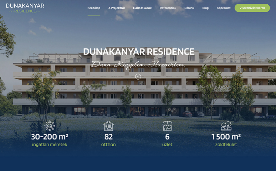A dunakanyarresidence.hu egy önálló projektoldal, amely egy hiánypótló dunakanyari lakópark fejlesztést mutat be. A honlap marketingcélja, hogy széles körben ismertté tegye a beruházást, bemutassa annak értékeit és előnyeit, valamint teljes körű tájékoztatást nyújtson a lehetséges érdeklődőknek a projekt részleteiről, a tervezett szolgáltatásokról és az elérhető lakásokról. Egy átlátható, inspiráló és megbízható online felület létrehozására törekedtünk, amely támogatja az érdeklődők döntéshozatalát és a projekt iránti bizalomépítést. A honlapon egy interaktív lakástérkép segíti az érdeklődőket az elérhető lakások áttekintésében. A térképen az egyes lakásokra kattintva megjelennek azok legfontosabb paraméterei – például az alaprajz és a lakás elhelyezkedése az adott szinten –, így a látogatók gyorsan és egyszerűen tájékozódhatnak a kínálatról, és könnyen megtalálhatják a számukra legmegfelelőbb otthont.Célcsoport: