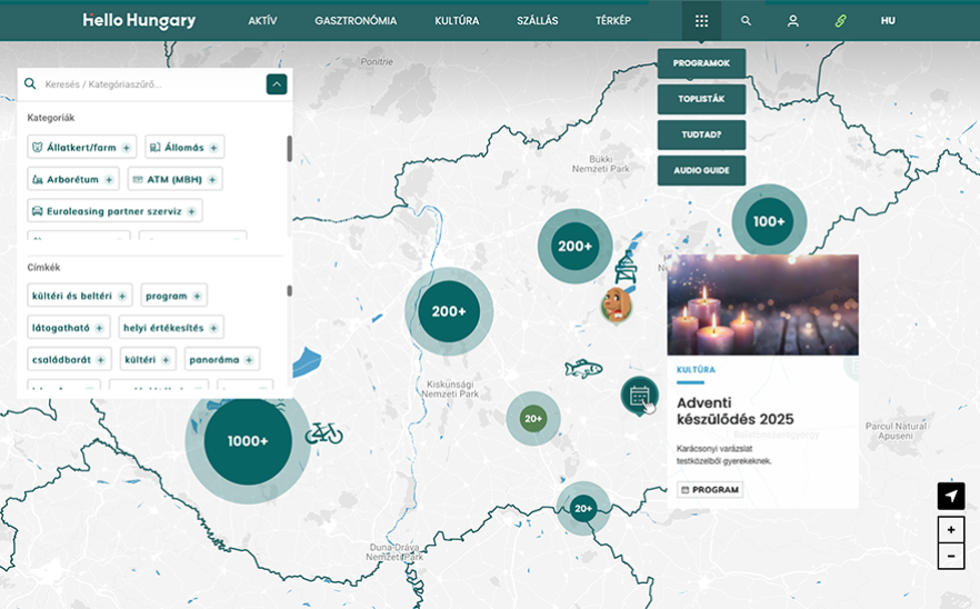 A Hello Hungary online turisztikai platform célja praktikus iránytűként támogatni az utazókat desztinációnk felfedezésében. A magyar és angol nyelvű magazin és közösségi média oldalai naponta frissülő utazásra inspiráló cikkekkel, audió- és videótartalmakkal, interaktív térképen is megjelenített izgalmas programokkal törekszik az úticélunk környezetében fellelhető látnivalók komplex profiljának bemutatására. A számos szűrővel ellátott térkép – rajta mindemellett több, mint 2300, fővároson kívüli turisztikai vonzerővel -, megkönnyíti a személyre szabott utazástervezést. A honlap és alkalmazás utazásra ösztönző tartalmaival az adatalapú működés irányába tart, sikeres nyereményjáték-kampányokkal s hírlevelekkel is elősegítve a teljesebb felhasználói élményt, a partnerek ismertségét, fenntartható üzletvitelét. A turizmus digitalizációjának jegyében immár intelligens globális kereső is segíti az AI erejével a látogatókat, hogy könnyedén rátaláljanak a számukra legmegkapóbb tartalmakra és autentikus turisztikai élményekkel gazdagodhassanak.Célcsoport: