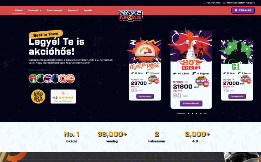 A Budapest Shooting 2 weboldalának fejlesztése során célunk egy modern, turisztikai fókuszú platform létrehozása volt, amely az élményközpontú márka pozícióját erősíti. A feladat nem csupán az új lőtér bemutatása volt, hanem egy olyan online felület kialakítása, amely a nemzetközi látogatók számára azonnal vonzó, informatív és gyorsan konvertáló. A weboldal vizuális világa az adrenalin, a biztonság és a professzionalizmus egyensúlyára épül – dinamikus mozgóképekkel, letisztult struktúrával és erőteljes hívásokkal az akcióra. A fő cél az online foglalások növelése, az új csomagok kiemelése és a Google keresésekből érkező turisták hatékony megszólítása volt. A reszponzív felület, a többnyelvű tartalom és az intuitív UX együtt egy magával ragadó, konverzióra optimalizált digitális élményt hozott létre.Célcsoport: