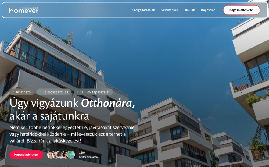 A homever.hu professzionális ingatlankezelési és bérbeadási szolgáltatásokat bemutató weboldal letisztult, üzleti hangvételű dizájnnal kommunikálja a vállalat tapasztalatát és megbízhatóságát. Átlátható struktúrában ismerteti a teljes körű lakáskezelési folyamatot - a bérlő-kiválasztástól a karbantartásig és jogi ügyintézésig -, miközben világos, konverzióra ösztönző cselekvés-elemek (pl. kapcsolatfelvételi űrlapok) segítik a felhasználói lépéseket. A tartalom hangsúlyos elemei a referenciák, ügyfélvisszajelzések és szolgáltatási statisztikák, amelyek hitelesítik a professzionális szolgáltatásokat. A reszponzív kialakítás stabil élményt biztosít minden eszközön. A weboldal emellett blog-szekcióval erősíti az iparági hitelességet és SEO-értéket is, tájékoztató cikkekkel támogatva a látogatókat a bérbeadási folyamatokról és trendekről.Célcsoport: